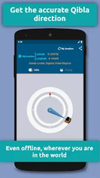 このアプリは非常に正確に設計されており、ユーザーは「自分の場所」ボタンをタップするだけで自動的に場所を設定するだけで済みます。場所が設定されると、アプリはユーザーの場所に基づいてキブラの方向と断食の時間を計算します。このアプリはオフラインで動作し、ユーザーの地理的な場所の名前を検索するためにのみインターネット接続が必要です。また、アプリはユーザーの場所を記憶して、デバイスの位置情報への常時アクセスを防止します。ユーザーが場所へのアクセスを許可したくない場合は、GPS座標を手動で入力することもできます。